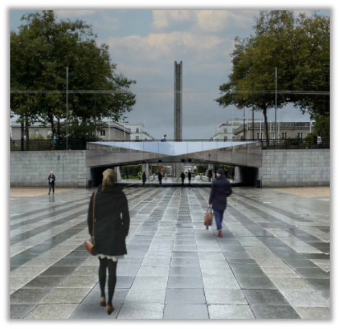 - Finition de l’habillage en inox polimiroir permettant de réfléchir le sol et le ciel, en créant un jeu à la fois d’effacement de l’encorbellement et de reflets des matériaux environnants (équivalente au « Miroir aux Energies » avenue Le Gorgeu).