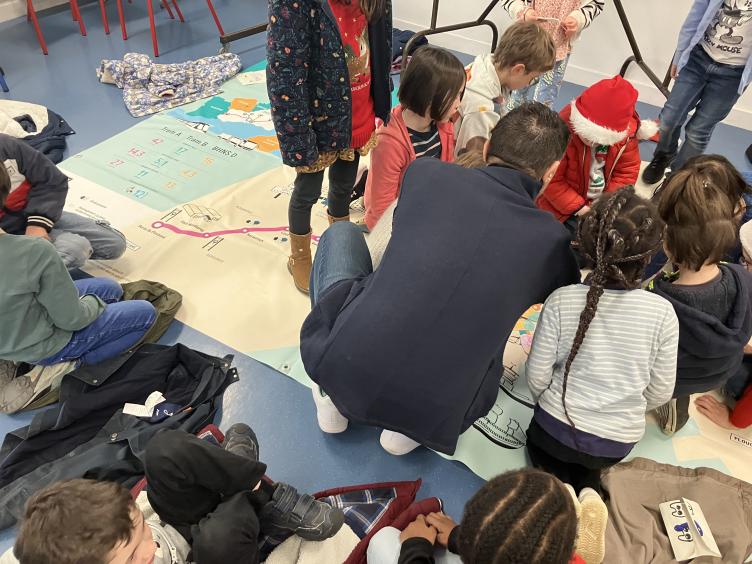 Ensuite les enfants ont pu tester leurs connaissances de la ville, du futur réseau de transport en commun et de leur environnement proche, sur le tapis de jeu représentant les lignes A, B, C & D, en y plaçant des magnets représentants des équipements, des parcs, à proximité de l'école et au delà.